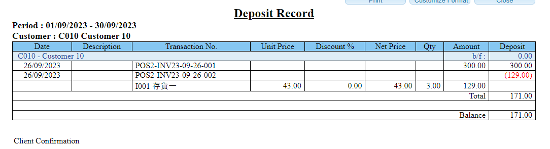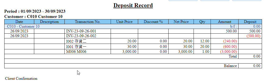 銷售分析報表 -> 按金狀況,可以查看客戶按金收取和扣減的記錄: