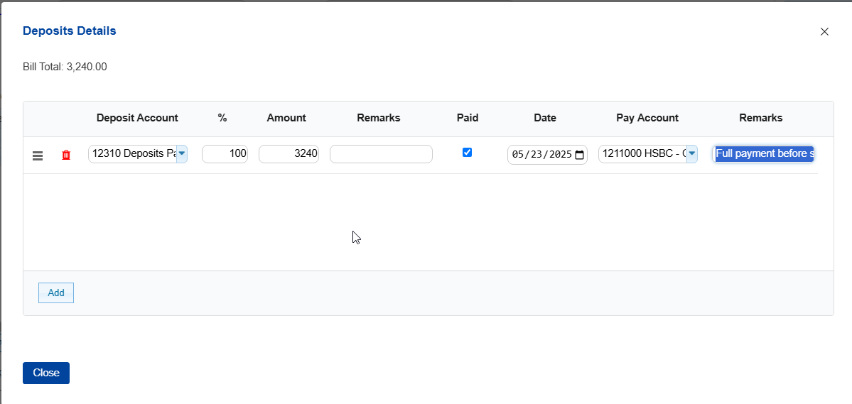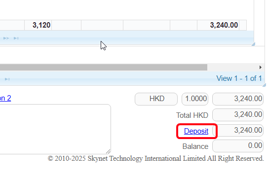 可以針對發票逐行輸入多項按金。用戶可依據整單發票金額輸入相應的百分比,系統將自動計算並填充按金金額;用戶亦可根據實際要求,直接手動輸入確切的按金金額。